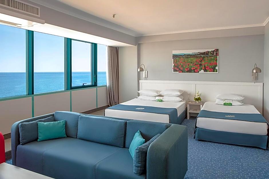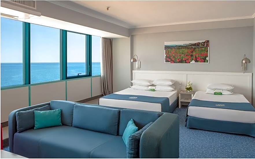 Deluxe room with Sea View, 2 adults + 2 children is 431 square feet and includes either a king-size bed 150-183 width or a single bed 80-130 width.