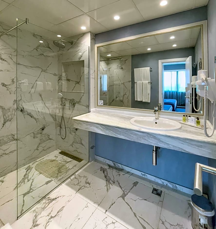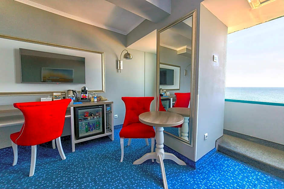 Superior room with sea view, Single Use is 431 square feet and includes either 2 single beds 80-130 width or a king-size bed 150-183 width plus a sofa bed plus balcony, desk, cable tv, hairdryer, tea and coffee making facilities , safe, bathrobes, and slippers.