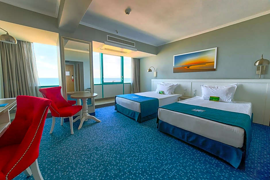 Standard room with sea view, 2 Adults is 323 square feet and includes 2 single beds 80-130 width plus living room.