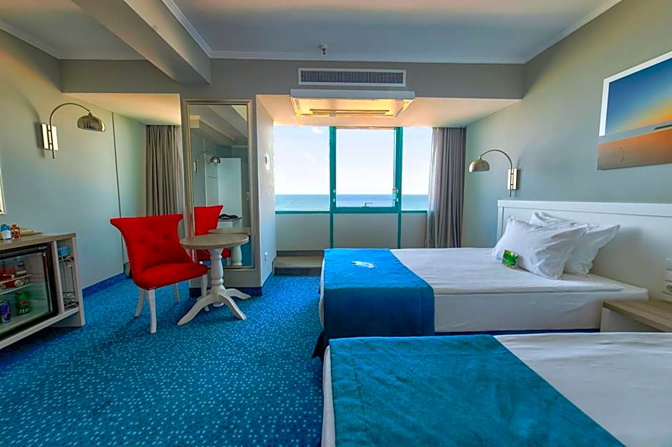 Superior room with sea view, 2 adults is 431 square feet and includes either 2 single beds 80-130 width or a king-size bed 150-183 width plus a sofa bed plus balcony, desk, cable tv, hairdryer, tea and coffee making facilities , safe, bathrobes, and slippers.